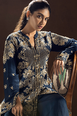 Blue Dori, zardozi, and metallic sequins embroidered straight Kurti, it is paired with an organza palazzo.