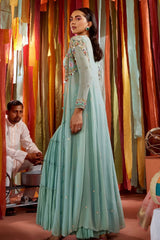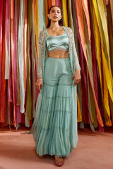 Mint green georgette cape with colorful resham thread-work, highlighted with pearls and beads, the cape has hand-made latkans hanging at the yoke and sleeve. It is paired with a bustier in satin and a georgette tiered sharara.