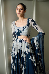 Blue floral printed georgette anarkali featuring highlighting of flowers with cultana sequence and mirror. It has a cut-out detail at the waist. It is paired with a matching Georgette dupatta and organza borders.