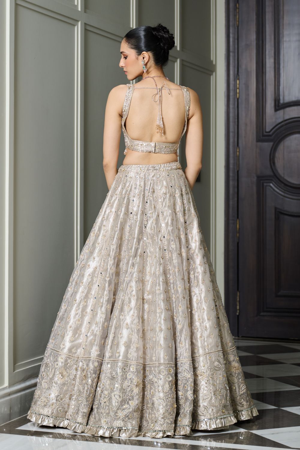 Zari, mirrors and pearl embroidered halter neckline blouse with an opening in the front. The lehenga is beautiful mix of embroidered bootis and jaalwork at the bottom. The lehenga is paired with a pure silk organza double scallop dupatta.