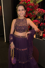 Purple mukaish georgette ( 2 different densities) 4 tiered lehenga with a net hand embroidered blouse and dupatta. The blouse has a criss-cross back with tassel detailing.