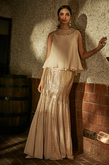 Ivory Mermaid Fit and Flare Skirt in Dual Colored Sequins Sheeting Paired With Bias Georgette Top With Cheeta On Neck and Armhole.