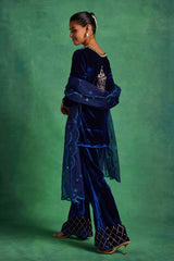 Blue Velvet Straight Kurta With Pants and Dupatta Set