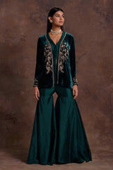 Green Velvet Jacket With Silk Peplum and Sharara Set