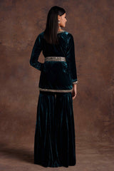 Green silk velvet peplum with hand embroidery detailing at the neckline, center front and hem. It is paired with a matching hand embroidered belt as well as sharara pants.
