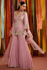 Mauve georgette hand embroidered peplum with gathers. It has a fully embroidered yoke with scallop borders. It is paired with a georgette sharara with embroidery detailing at thigh and borders and a net dupatta with borders and sprinkling.