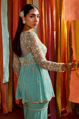 Mint green net and georgette hand embroidered peplum in gold and white color embroidery. It has net sheer sleeves and gathers at the peplum. It is paired with a matching sharara in georgette and has embroidery at the hem and thigh.
