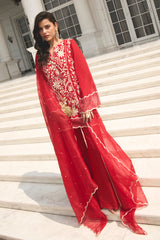 Red georgette kalidar kurta and pants paired with an organza scallop embroidery dupatta. The kurta has floral resham and zari aari work all over the kurta and check detail embroidery at the sleeve hem.