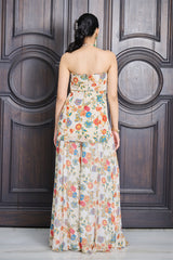 Ivory satin organza fabric tube kurta in a multi colour floral print. The tube top features intricate floral highlight embroidery with cutdana, sequin and mirror. It is paired with a matching chiffon fabric sharara and we have completed the look with an organza dupatta.