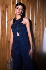 Navy blue jacquard cross shoulder jumpsuit. It has tonal cut daana and zircon embroidery.